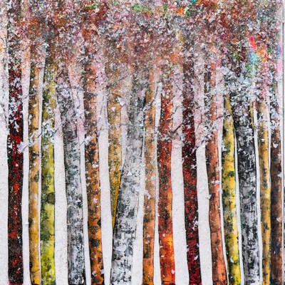 Blossoms by Haleh Mashian captures the quiet beauty of a birch forest in bloom, where soft petals and textured bark create a serene yet vibrant atmosphere. The vertical rhythm of the tree trunks, painted in shades of white, gold, and earthy browns, gives the composition of Blossoms a natural balance, while the delicate canopy of blossoms introduces movement and a sense of renewal.