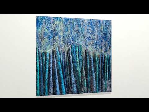 At the heart of Blue Moon lies a delicate tension between abstraction and representation. While the vertical forms clearly suggest a wooded landscape, the expressive interplay of light and shadow transforms the scene into an emotional landscape—one of solitude, introspection, and nocturnal mystery. The upper portion of the composition shimmers with a cosmic luminescence, where moonlight filters through the dense canopy, casting a spectral glow that enhances the work’s dreamlike presence.