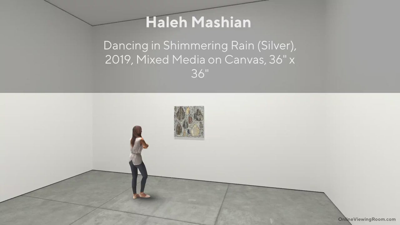 In her 2019 piece “Dancing in Shimmering Rain (Silver),” artist Haleh Mashian pushes the boundaries of creativity by exploring a number of techniques to adorn the surface of the wooden panel support. Beginning with a backdrop infused with layers of silver, she overlays this foundation with delicate, nuanced neutrals within the raindrop motifs.