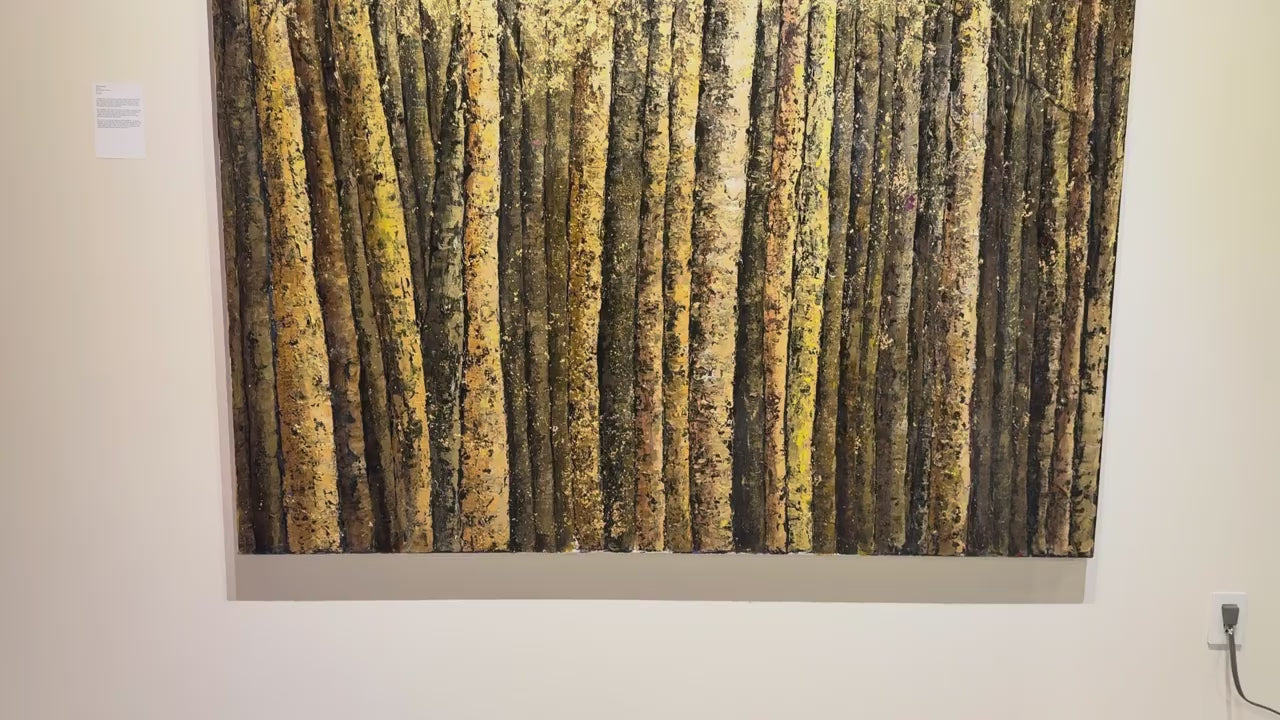 In “Dorado”, the artist conjures a forest bathed in golden radiance, capturing a sense of ethereal stillness and quiet grandeur. The composition is a meditative study of texture and depth, where the verticality of towering tree trunks contrasts with the richly textured canopy above. An interplay of light and shadow creates a hypnotic rhythm, drawing the viewer into an immersive landscape that bridges the realms of realism and abstraction.