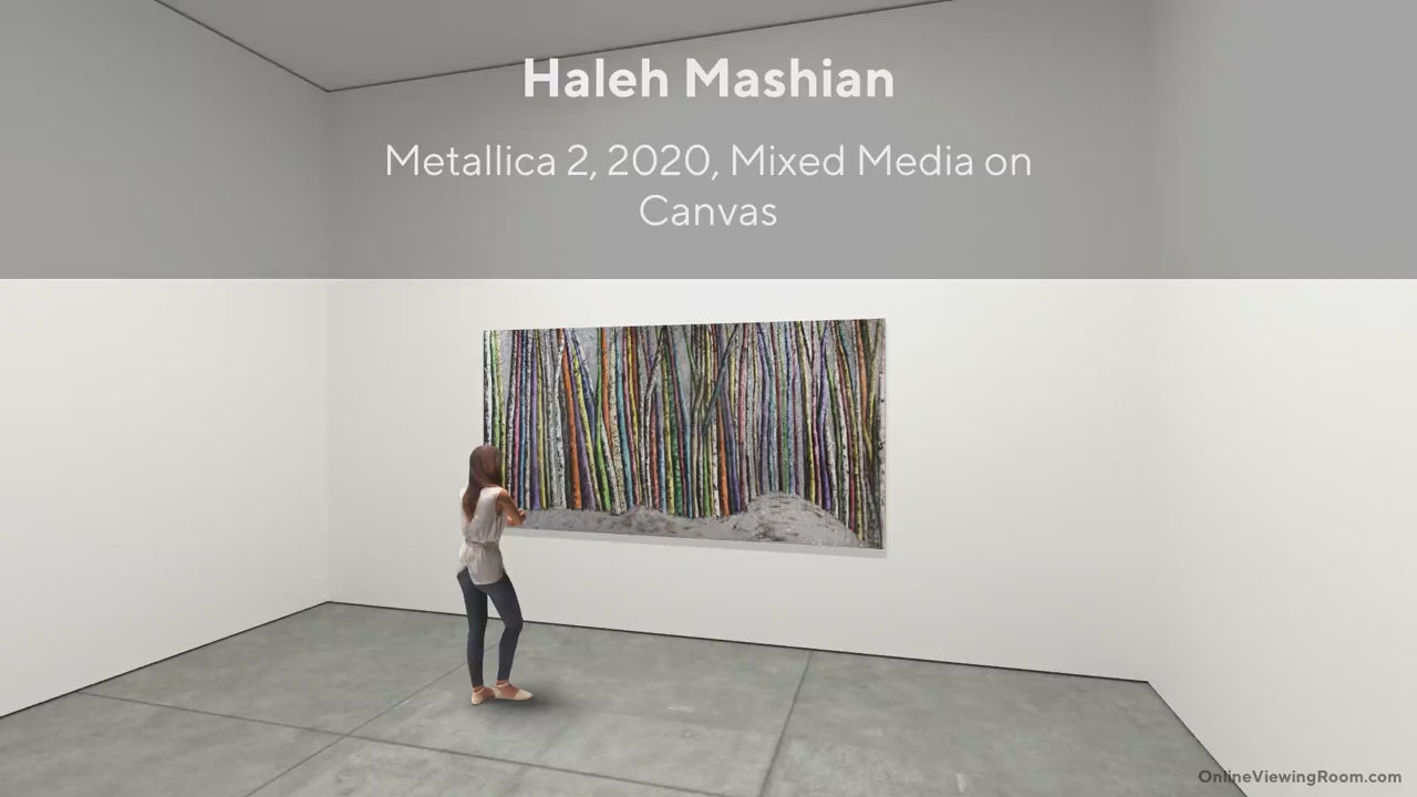 In Metallica II, Mashian transforms the natural world into a prismatic dreamscape, reimagining an ordinary forest as a surreal, otherworldly spectacle. The verticality of the trees, reminiscent of birch or aspen, is fractured by a kaleidoscopic spectrum of color, where luminous hues of emerald, amethyst, tangerine, and violet cascade like liquid light. Against a shimmering, silver-dusted background, the composition of Metallica II exudes a celestial radiance, existing in a space between the ethereal and the tangible. The rhythmic repetition of slender trunks draws the eye upward, creating a sensation of endless depth and movement, as if the entire scene is in perpetual transformation.