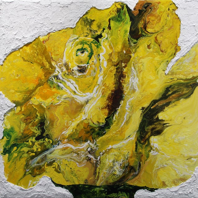 Morning Glory by Haleh Mashian is a vibrant, energetic take on floral art, where color and movement take center stage. Instead of capturing a rose in quiet stillness, Mashian transforms it into a dynamic force—pigments swirl, stretch, and burst across the surface, creating a sense of organic motion. Bold yellows and deep greens pulse with light and vitality, giving the impression that the flower is glowing from within.
