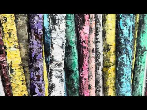 Untamed Beauty by Haleh Mashian is a vibrant and dynamic mixed media artwork that brings the natural world to life through a spectrum of bold colors and rich textures. The piece features a forest of slender tree trunks, each painted with striking hues ranging from vivid blues and greens to deep reds and purples.