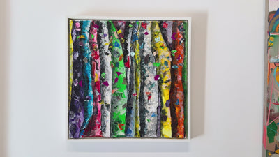 In Vibrant Whisper, Haleh Mashian captures the tenderness and delicateness of nature through a vibrant interplay of color, texture, and form. Carved vertical elements suggest a grove of trees, while scattered falling leaves made from different materials drift gently across the surface. These leaves bring variety and depth, softening the bold structure of the trunks and adding a tactile richness that shimmers with subtle shifts of light.